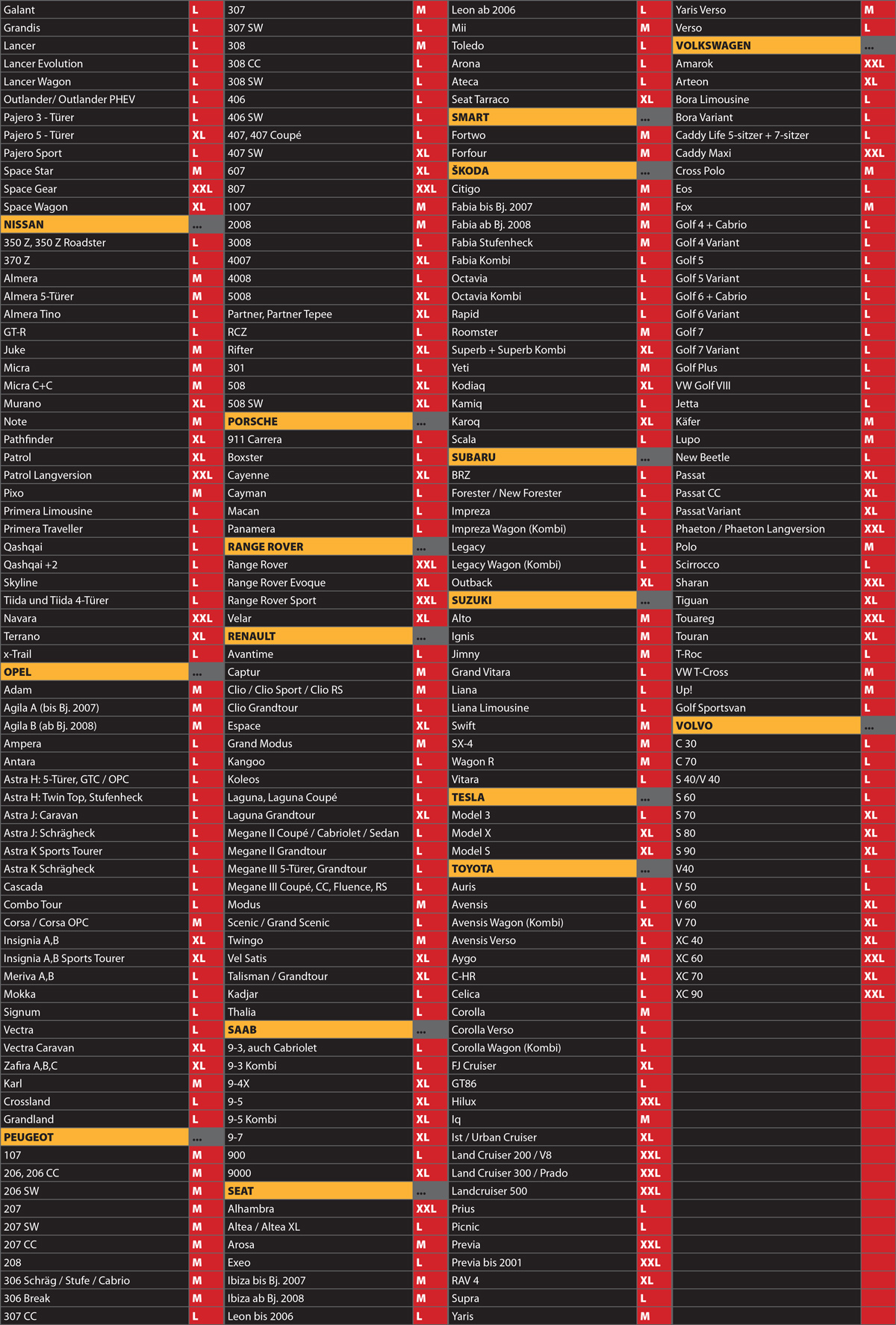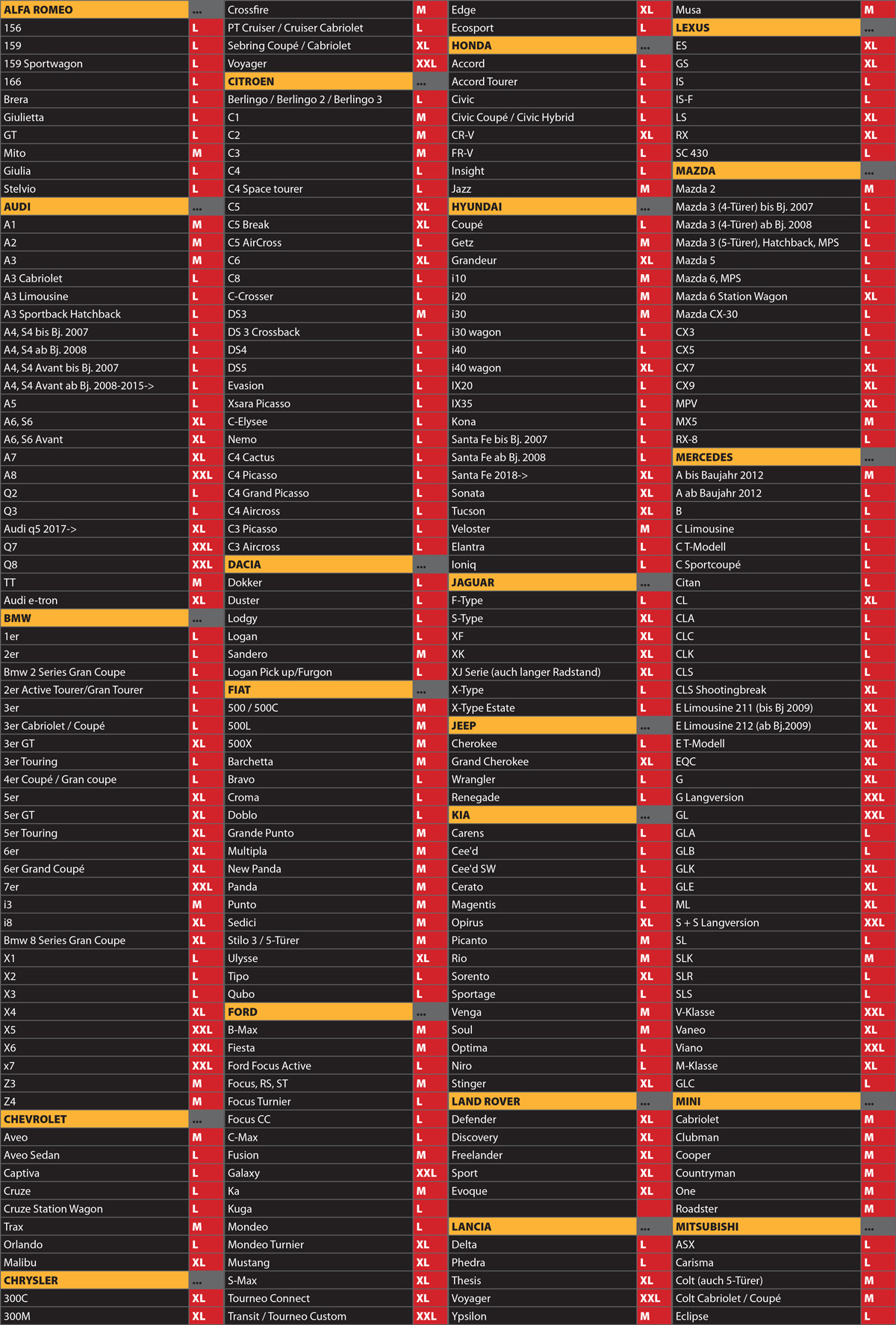 Vous trouverez les sacs en quatre tailles : M, L, XL, XXL, dans le tableau ci-dessous, vous trouverez le sac approprié à votre véhicule.